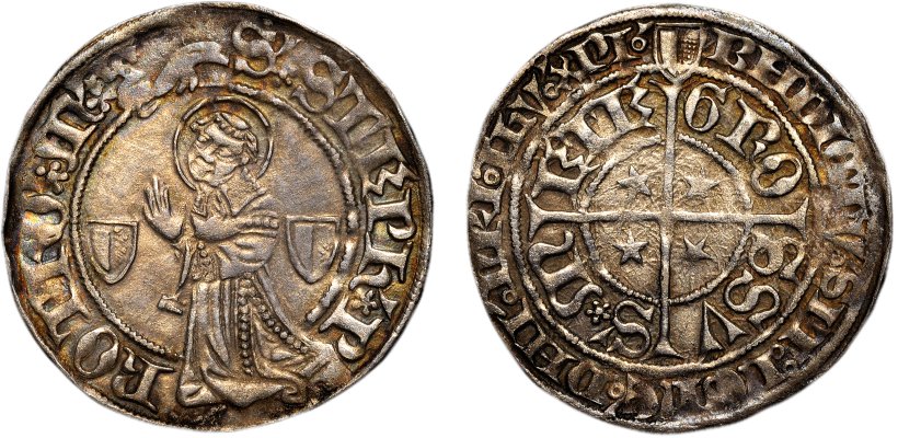 Åts omskr: S STEPH P ROTHO M Åts bild: En knäböjande Sankt Stephan. Frs yttre omskr: BNDICTV SIT NOME DNI NRI IHV XPI Frs inre omskr: GROSSVS METE