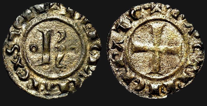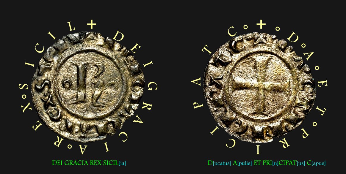 Det är inte lätt att tyda omskrifterna på ovanstående mynt trots att det är i hyggligt skick, i synnerhet när den latinska inskriften på frånsidan är starkt förkortad. På åtsidan torde det dessutom vara frågan om en felgravering. Första I i SICIL ser konstigt ut. Observera även att kungens namn inte finns med i omskriften. Det är K i fältet på åtsidan som upplyser om vem som är myntherre.