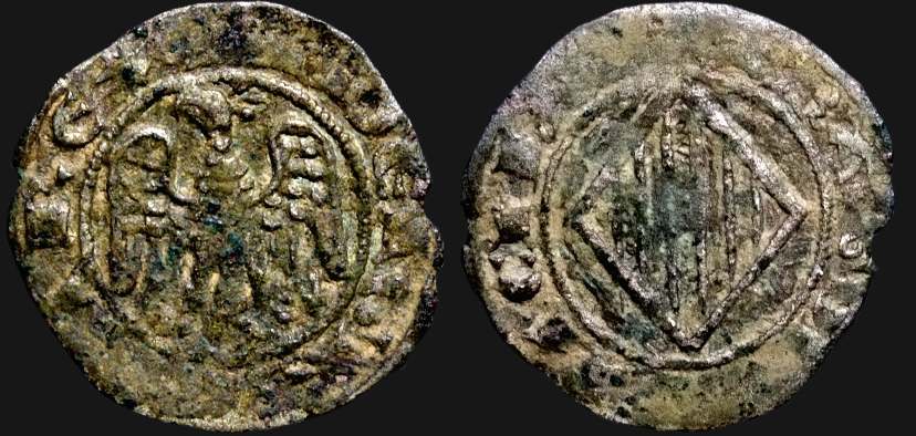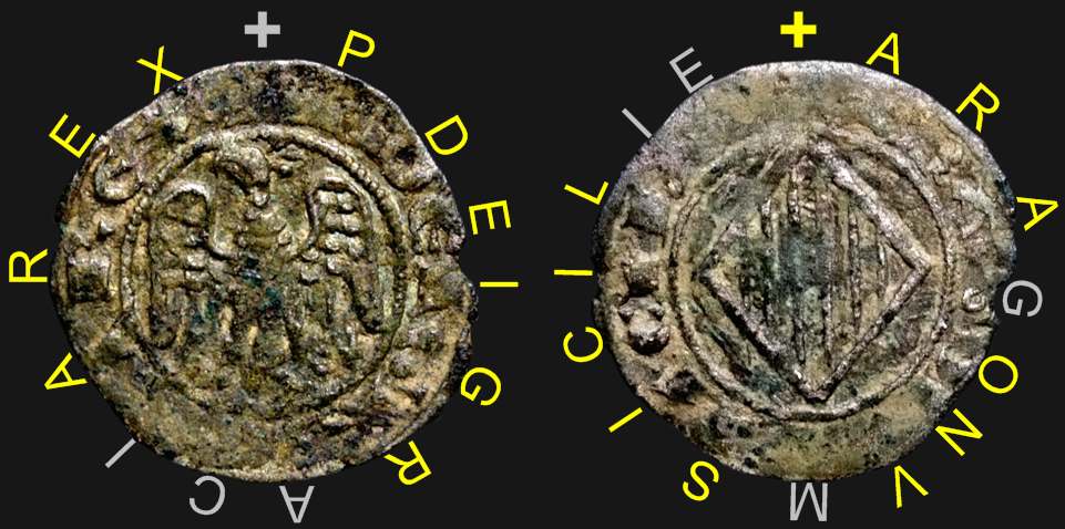 | Åts. omskrift: P[eter] DEI GRACIA REX Peter, av Guds Nåde, kung | Frs. omskrift: ARAGONVM SICILIE Aragonien [och] Sicilien | |