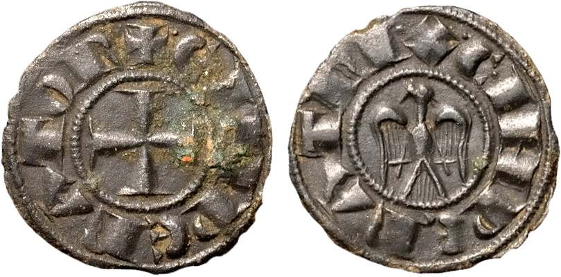 Fredrik II ansåg sig vara kung av Jerusalem från 1229 till 1243. Man kan tänka sig att ovanstående mynt är från denna tid.