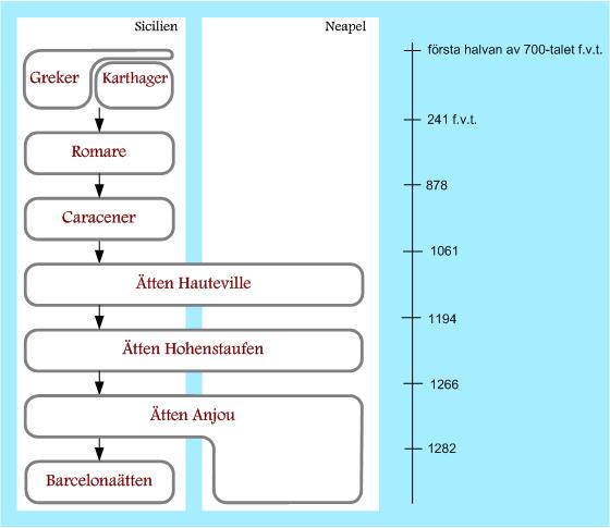 Sicilien blev under 1300-talet ett självständigt kungadöme som regerades av någon ur den kungliga familjen i Aragonien. Från år 1409 var Sicilien en del av kungadömet Aragonien och under åren 1479-1713 var ön en del av Spanien.