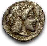 Silvermyntet som visas inledningsvis till vänster om rubriken är en obol med en diameter av 10 mm och en vikt av 0,600 g. Myntet är slaget 485-478 f.v.t. i Syrakusa. På åtsidan ser vid gudinnan Artemis. På frånsidan visas ett hjul med fyra ekrar. Ref.: Sear 917.