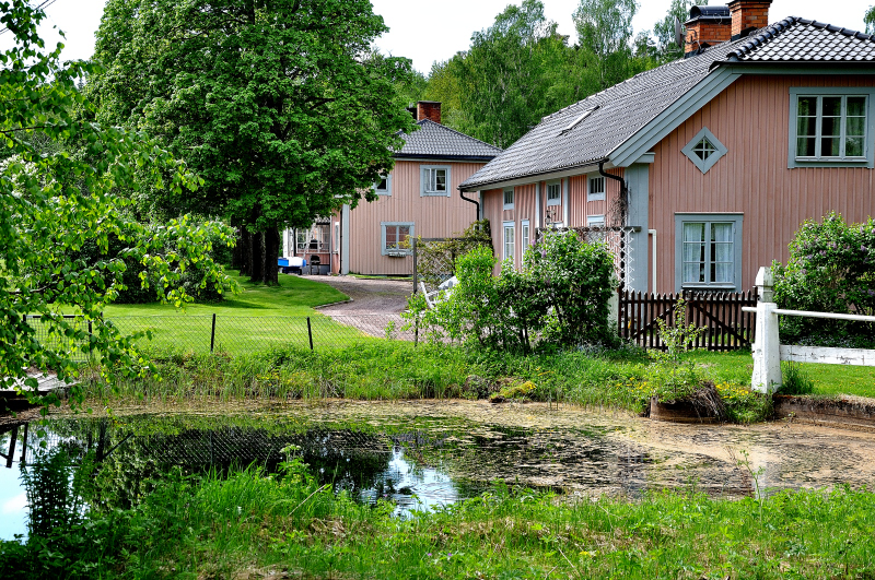 ![]() Strax väster om dammen ser vi de två flygelbyggnaderna. | De "mannerheimska flyglarna" med kontorsflygeln närmast. Foto L Castenhag |