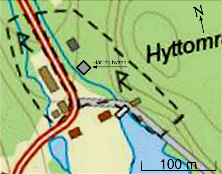 Den långa byggnaden väster om vägen är en ladugårdsbyggnad. I kartan har en markering gjorts som utvisar platsen för masugnen. Norr om den platsen står en byggnad som idag används som stall.
