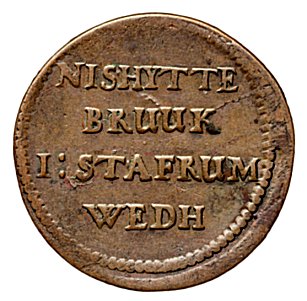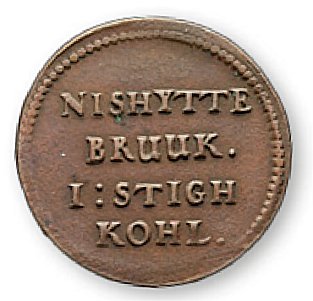 En stigh kohlEnligt A W Carlsson motsvarade en kolstig 12 tunnor eller cirka 19 hektoliter (= 1,9 kubikmeter). Men volymmåttet storstig fanns också, och en storstig kunde motsvara upp till två kolstigar. Vilken volym som avses med polletten från Nisshytte är inte känt, men kanske var det storstig som gällde. | ![]() Foto Numismatiska klubben Uppsala. Ref: Sti 99:2 |