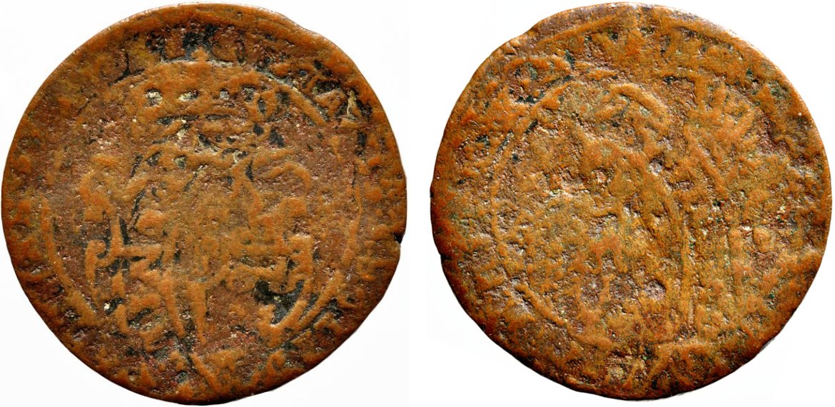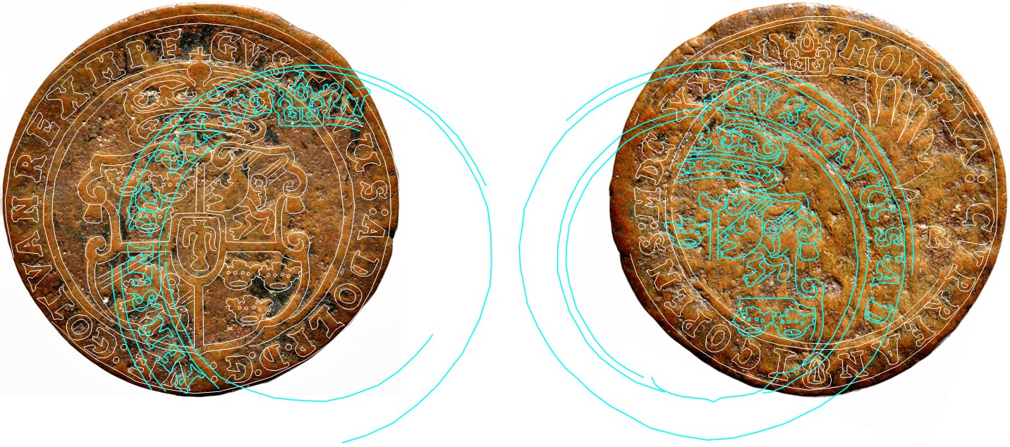 Med präglingsdetaljernas konturer ifyllda blir det lite lättare att se vad som har hänt. Myntet är dubbelpräglat med delar av frånsidans prägling synlig på åtsidan och delar av åtsidans prägling synlig på frånsidan.