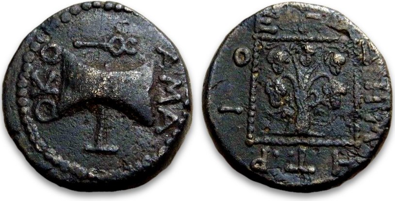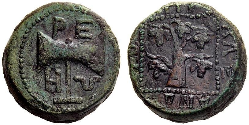 På myntets åtsida ser vi en herde mellan två tjurar samt inskriptionen ORR-E-Σ-KOI.