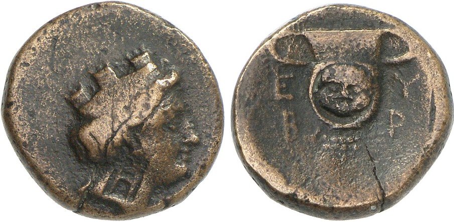 På åtsidan visas gudinnan Kybele med krona, vänd åt höger.