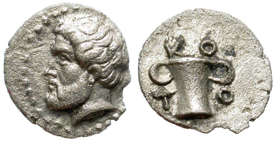 Åtsida: Dionysos skäggprydda huvud vänt åt höger.