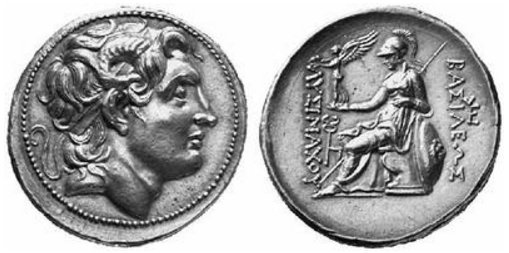 Frånsida: Athena med Nike i sin högra hand. Inskrift BAΣIΛEΩΣ / ΛYΣIMAXOU.