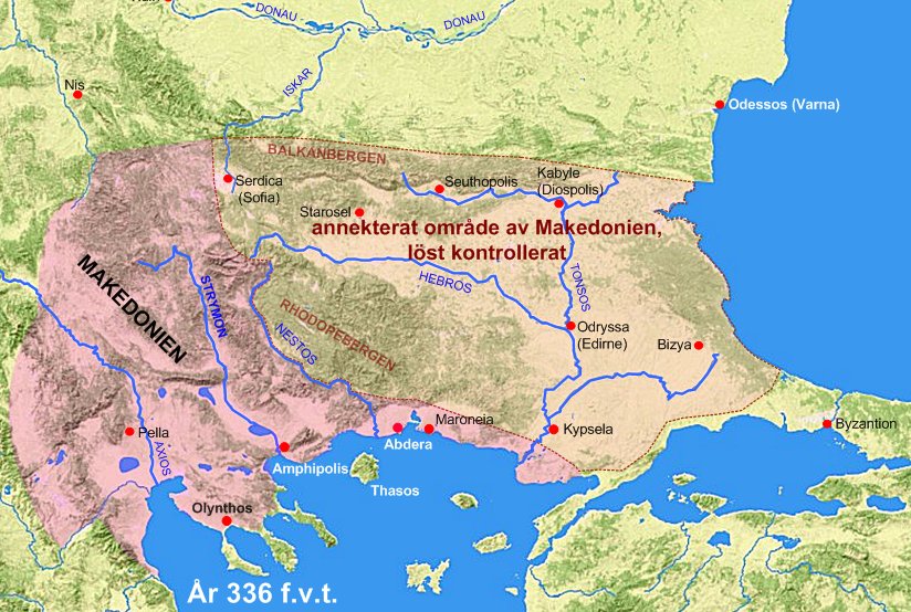 Makedonien och Thrakien år 336 f.v.t. Forntida berg och floder enligt www.pleiades.org