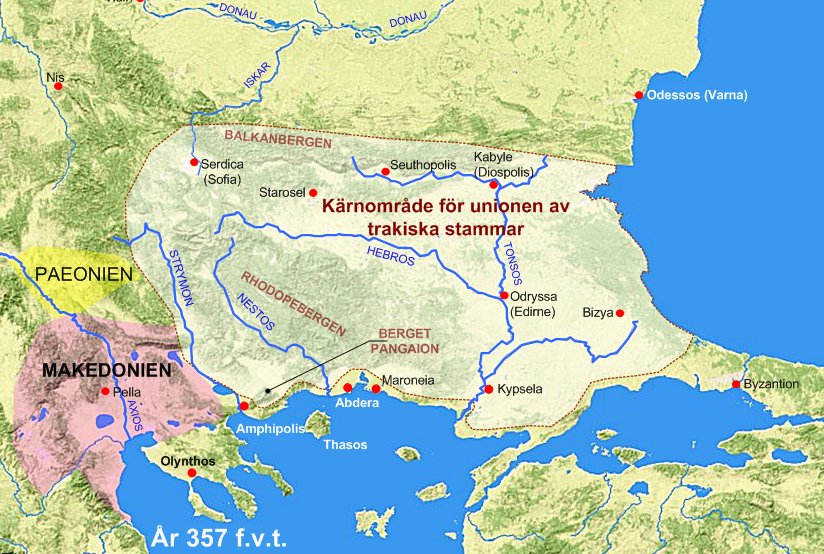 Makedonien och Thrakien år 357 f.v.t. Forntida berg och floder enligt www.pleiades.org