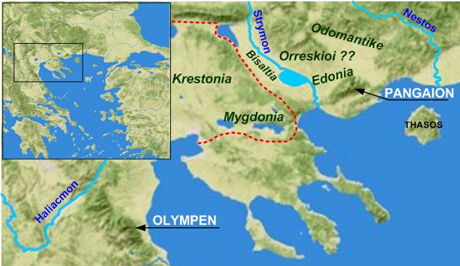 Ibland stöter man på uppgiften om att kulten kring Dionysos[1] och legenden kring Orfeus skulle ha sitt ursprung i Trakien, närmare bestämt i trakten av berget Pangaion. I detta berg fanns dessutom rikliga silverfyndigheter och av silvret slog man mynt av yppersta klass. De äldsta mynten är från tidigt 500-tal f.v.t. Tyvärr är de historiska källorna knapphändiga så vi vet inte så mycket om de människor som uppvisade denna konstfärdighet.