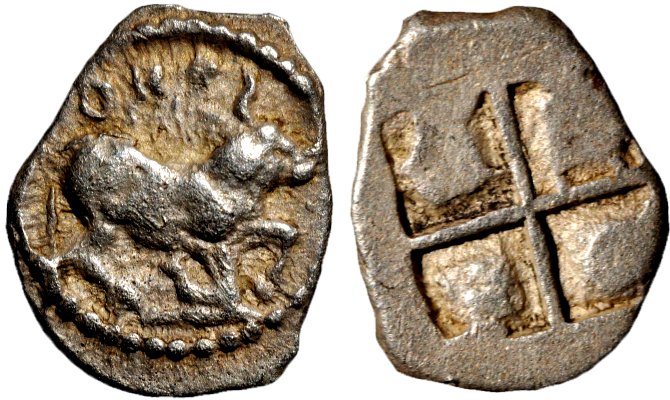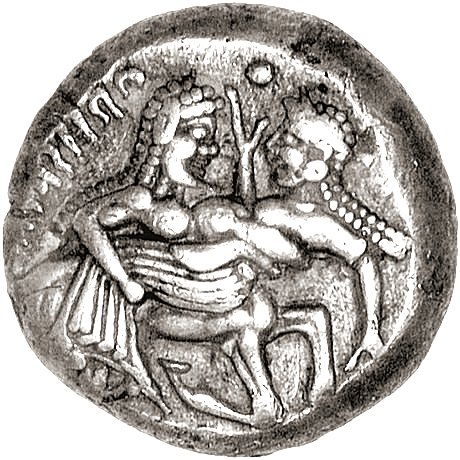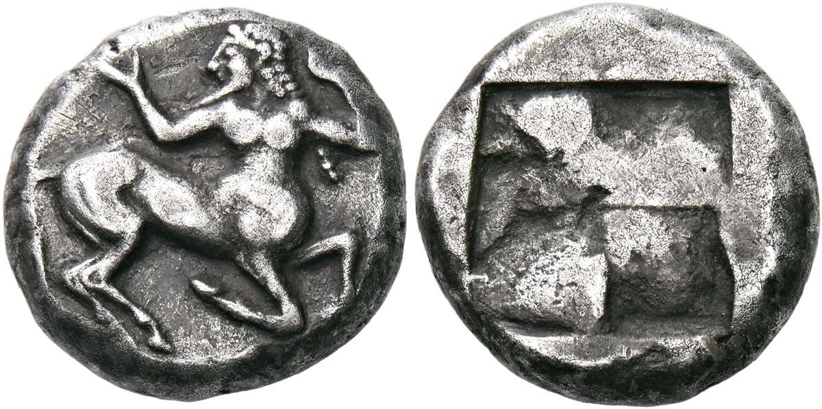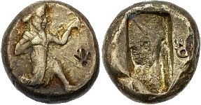 | På siglos från Persien ser vi att kungens högra ben är böjt vilket kan betyda att kungen står på knä (eller att han rör sig framåt). Hade de trako-makedonska gravörerna låtit sig inspireras av Persiens mynt månne? | ![]() Siglos ca 510 f.v.t. Darius I, Persien Foto: Forumancientcoins.com |