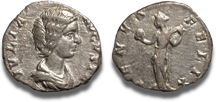 Septimus Severus denar, som presenterats ovan, har en vikt av 2,54 g och Julia Domnas denar har en vikt av 2,18 g. Man kan fundera över om dessa mynt är äkta, men studiet av auktionslistor har visat att Septimus Severus denarer i gott skick kan ha en vikt av 2,2-3,6 g. Julia Domnas denarer i gott skick kan ha en vikt av 2,1-3,6 g. De två presenterade denarerna ligger således i nedre delen av respektive spridningsintervall.