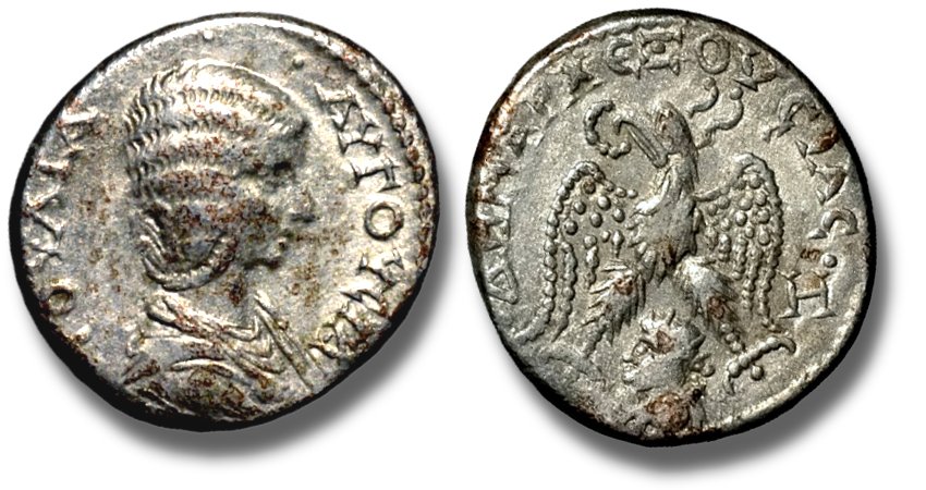I sin födelsestad Emesa (nuv. Homs) i Syrien lät Julia Domna slå tetradrachmer av silver. Se nedan. På frånsidan är det en örn och mellan örnens fötter är det en figur som är vänd åt vänster med krona på huvudet. Denna figur anses vara Shamas som var solgud och rättssystemets övervakare i den kult som hade fäste i Syrien på 200-talet. Julia Domnas tetradrachm är exempel på att man i de romerska provinserna höll fast vid sina traditionella myntsystem trots att man hamnat under Roms överhöghet.