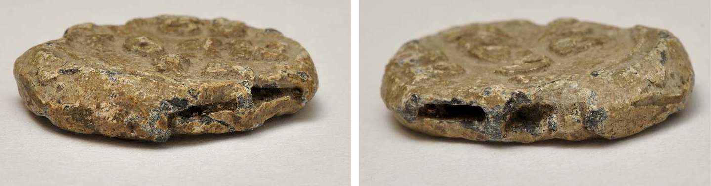 Se bilden av plomben sedd från sidan. Ursprungligen var hålen cirkelformade,
