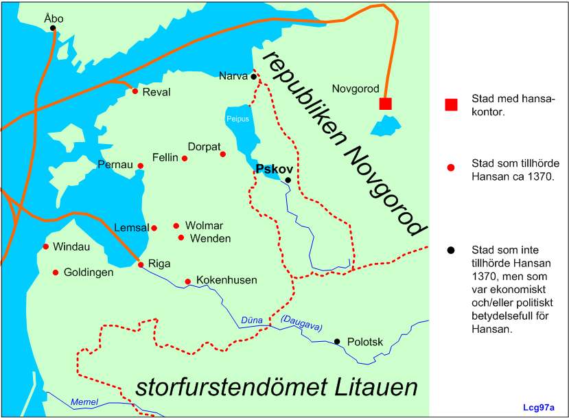 Hansans handelsnätverk på andra sidan Östersjön på 1300-talet.