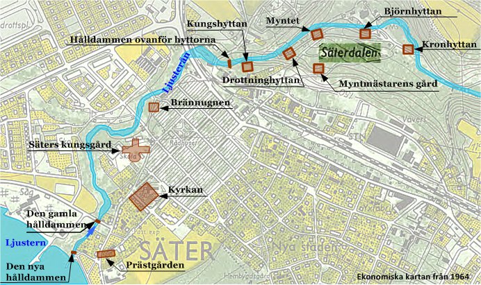 Positionerna för Sätters byggnader och dammar enligt en skiss från 1642 som upprättats av Kommerskollegii