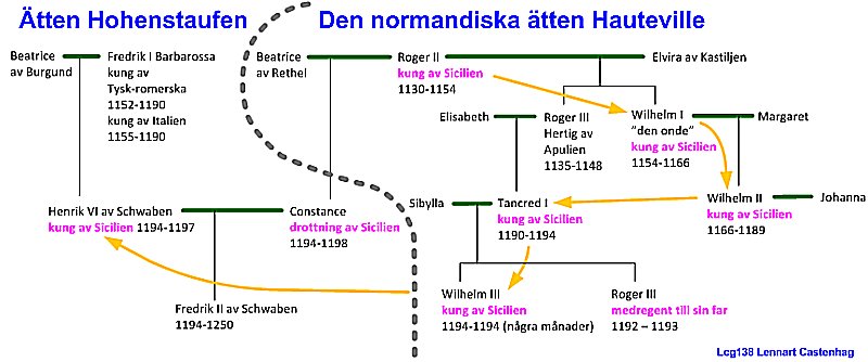 År 1194 avled Tancred hastigt och efterträddes av sin åttaårige son Wilhelm. Den tyskromerske kejsaren Henrik VI av huset Hohenstaufen hade några år tidigare ingått äktenskap med Constance som var faster till Tancred. Kejsar Henrik hade den bestämda uppfattningen att hans hustru Constance stod på tur i successionen som Siciliens drottning.