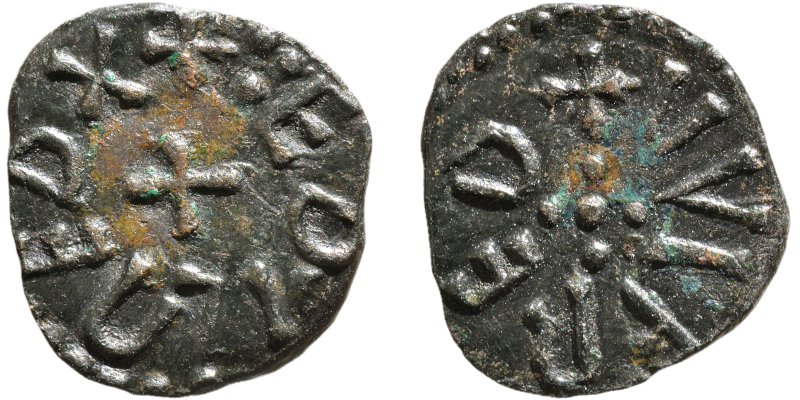 Styca (brons) 841 - 844, Ethelred II, Northumbria. Myntet är slaget under första regentperioden för kung Ehtelred II i Northumbria[2]. Diameter 11,5 x 13,2 vikt 1,130 g. (id 2812) Ref: SCBC 865, MEC(8) 804 Präglad i York av myntmästaren Wulfred.