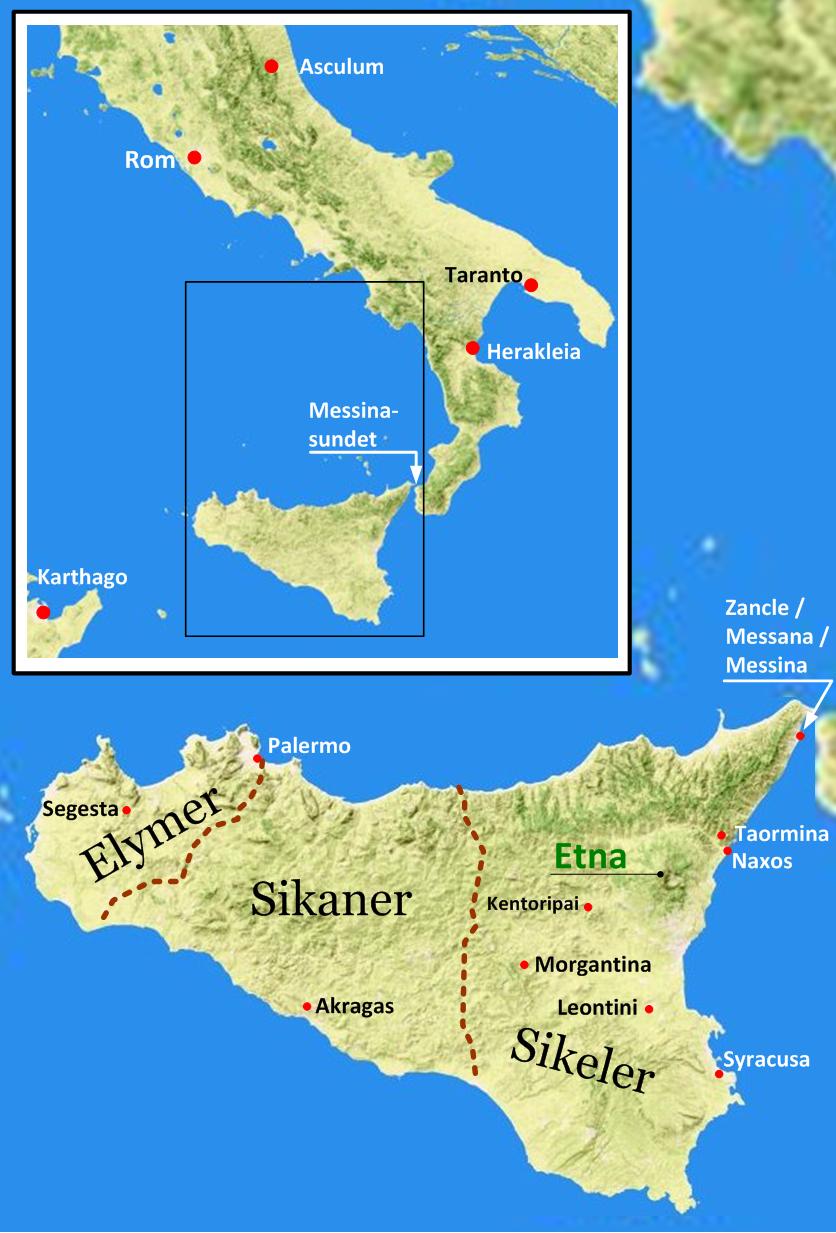 Gränserna mellan Siciliens tre ursprungsbefolkningar är i kartan utritade på ett ungefär eftersom de knappast kan ha varit exakt definierade.