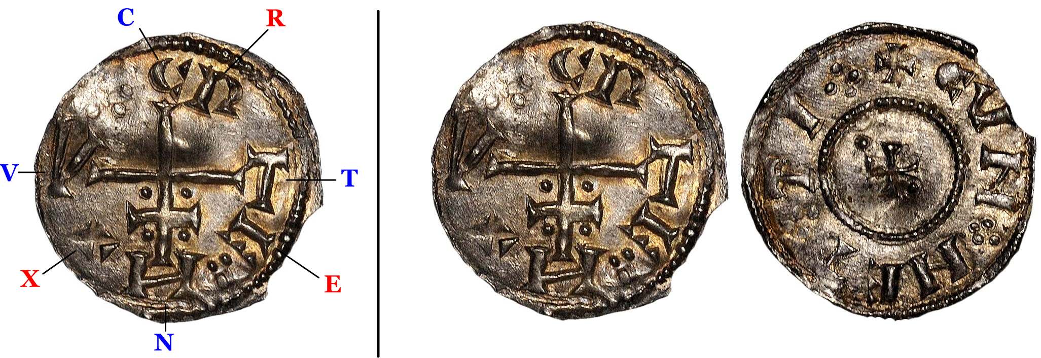 I korsvinklarna R E X, dvs CNVT REX (kung Cnut)