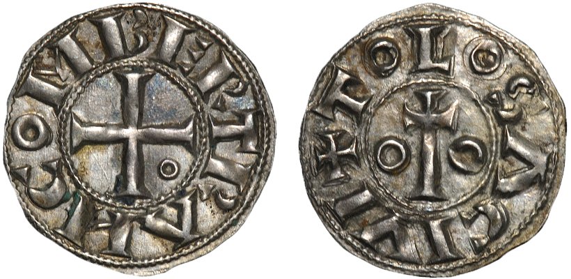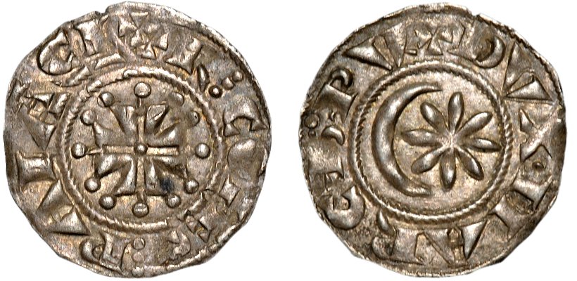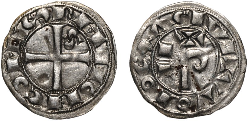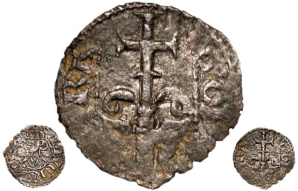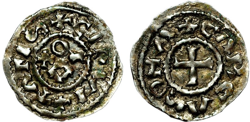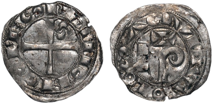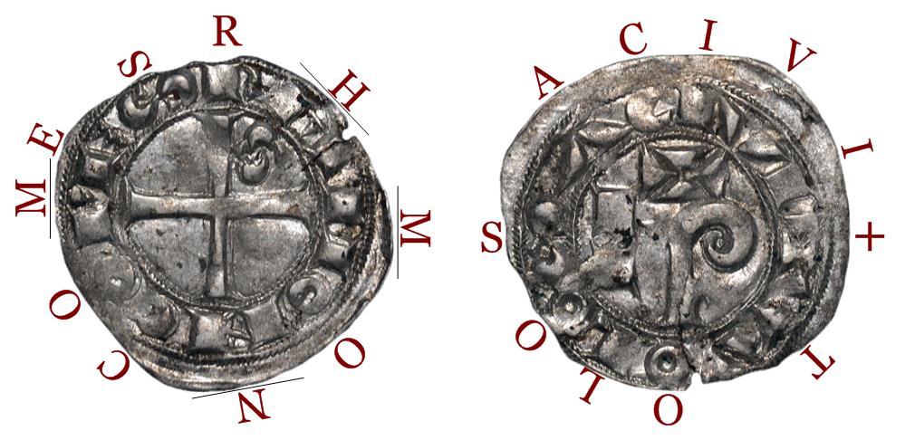 Monogrammet på åtsidan påminner om formationen av fyra ringar som kan ses på mynt slagna för greve Odo av Toulouse under åren 872-918/9.
