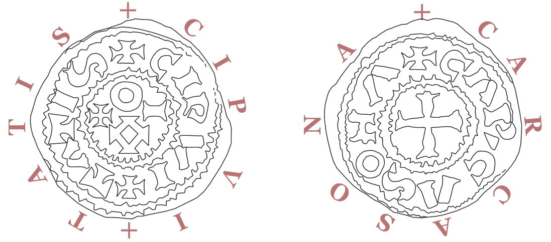 | + CIPVI + TATIS ett monogram bestående av fyra symboler | + CARCASONA ett kors inom den inre pärlringen |