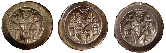 Nedan visas tre olika brakteattyper som utgavs av biskoparna i myntorten Hildesheim, 1240-60. De har en diameter på ca 26 mm, en vikt på ca 0,75 g och tjockleken är ca 0,11 mm. Notera att vikt, diameter, silverhalt och formen på plantsen är oförändrad mellan utgåvorna. Det är bara huvudmotivet som ändras.