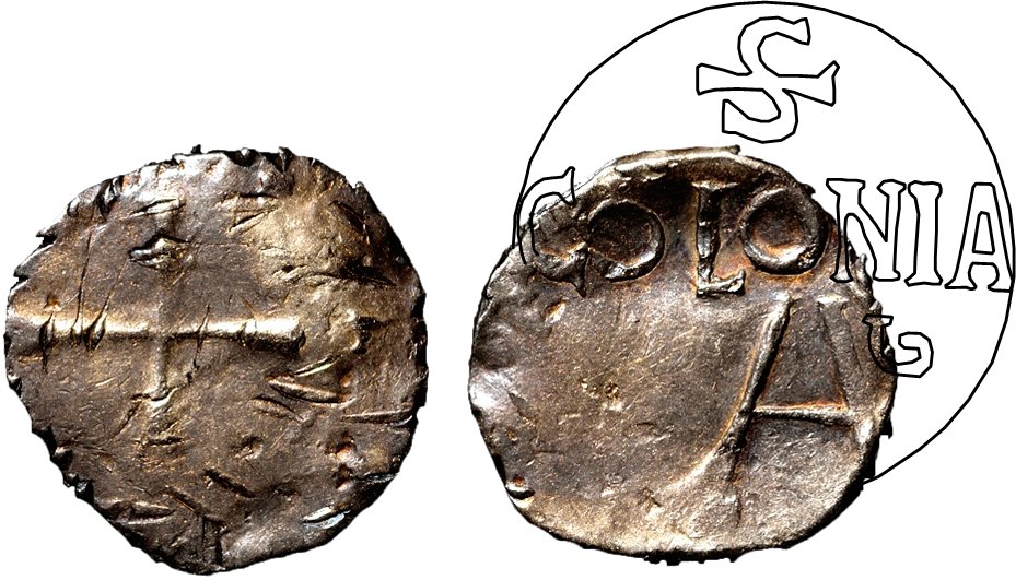 Bland Dannenbergs teckningar av kölndenarer finns det tre mynt som har det karaktäristiska Coloniamonogrammet med avseende på "öppet" A.