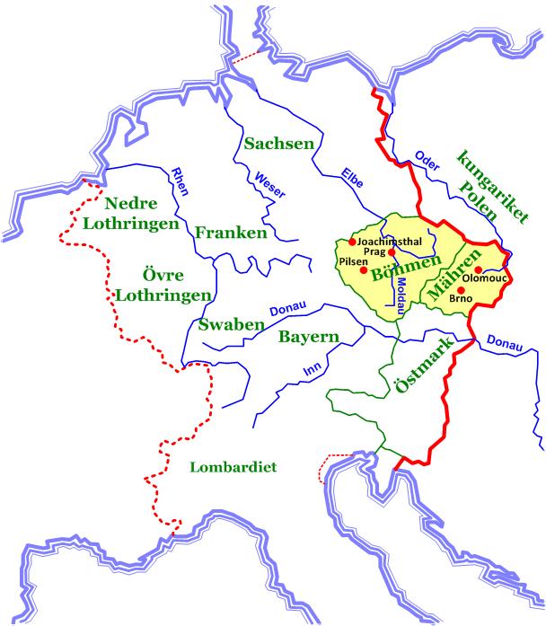 I Karl den stores rike, i den löst kontrollerade delen längst i öster, uppstod hertigdömen Böhmen på 800-talet.