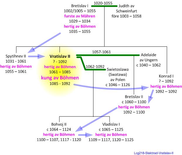 Hertig Bretislav I fick år 1031 sonen Spytihnev och något år senare föddes Vratislav. År 1055 gick Bretislav ur tiden och en strid uppstod mellan sönerna om vem skulle ärva hertigtiteln. Vratislav insåg att han var i underläge varför han sökte exil i Ungern. År 1061 gick Spytihnev ur tiden och Vratislav kunde kliva fram som hertig Vratislav II av Böhmen.