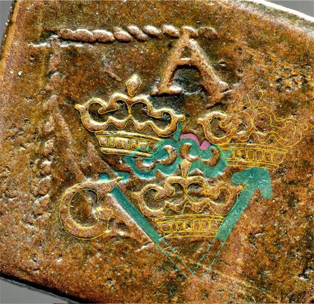 Avsiktlig åverkan kan också ge upphov till incusemönster. Se följande bild där någon har försökt "bättra på" ett svagpräglat M i frånsidans omskrift på ett säteröre 1628, Gustav II Adolf.