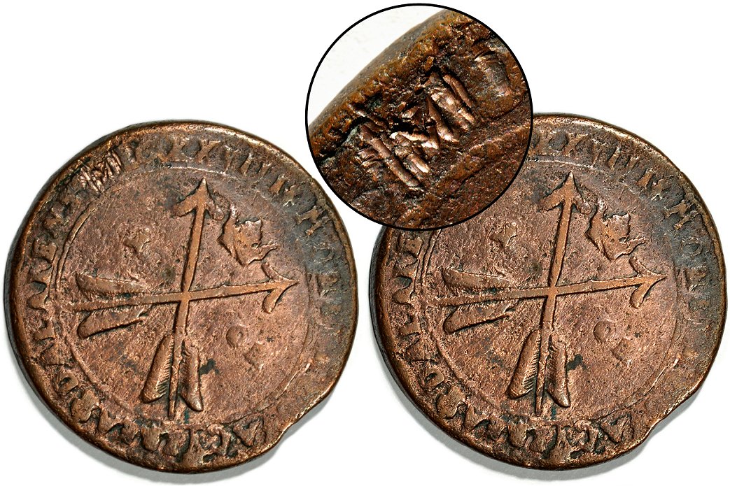 Myntets frånsida visas dels utan och dels med förstoringsglas.