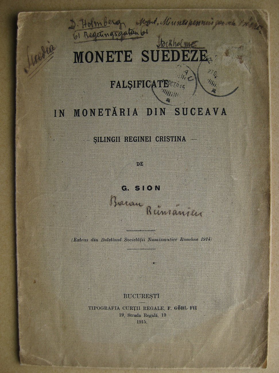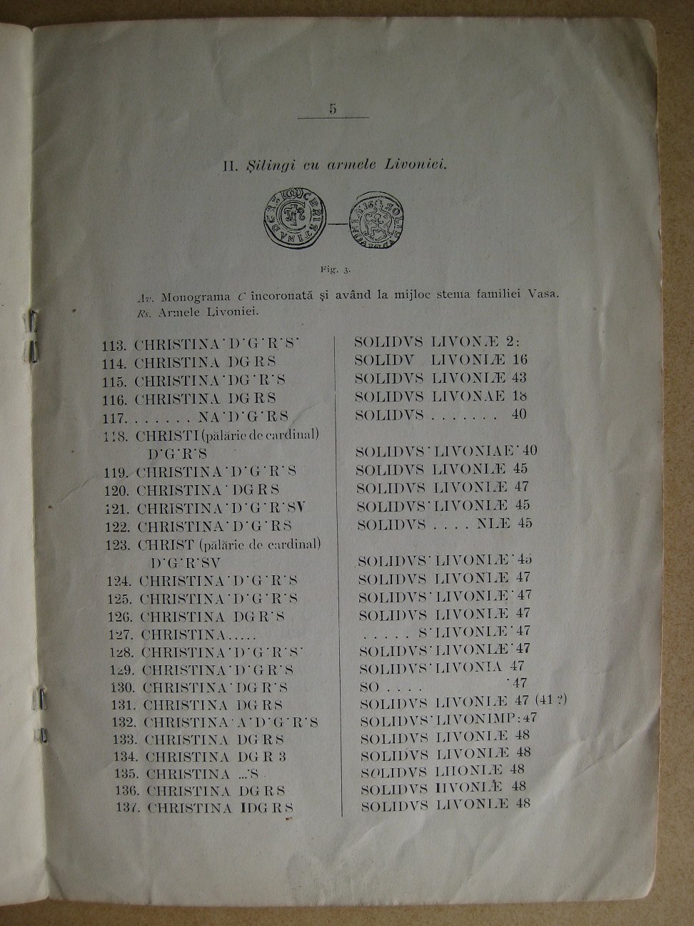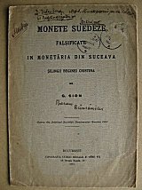 Litet och oansenligt är detta häfte. Författaren är G. Sion och utgivaren Societatii Numismatice Române, dvs. Numismatiska föreningen i Rumänien. Dess innehåll är dock mycket intressant alldeles särskilt för oss svenskar eftersom det berör falskmyntningen i Suceava. Som bekant förfalskades där solidus eller schillingmynt från de svenska besittningarna Riga, Livland och Elbing. I förordet redogörs för att dessa mynt präglades i Tarapanaua, grundlagt av Dabija-Voda i Suceava, Rumänien. De följande sex sidorna utgör en variantförteckning av författarens samling av dessa historiskt intressanta mynt. Notabelt är att Sveriges besittningsmynt (SB) tar upp 59 st. kända "årtal" från Riga med Kristinas "namn" medan G. Sion förtecknar 112 varianter, av vilka ett antal med största säkerhet dock är äkta mynt från den svenska besittningen. Trots allt innehåller förteckningen följande suceava-präglade "årtal" som saknas i SB; 6, 30, 32, 66, 69, 70 och 76. En annan av häftets förtjänster som gläder variantsamlaren är naturligtvis de noggrant förtecknade omskrifterna.