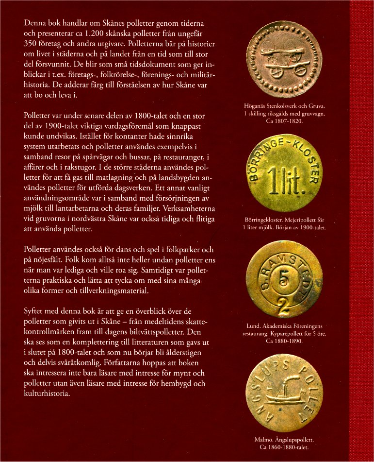 Boken om skånepolletter har A4-format och är tryckt i 300 exemplar. Den är resultatet av ett imponerande forskningsarbete som har tagit många år i anspråk. Här ges en överblick över de polletter som givits ut i Skåne - från medeltidens skattekontrollmärken fram till dagens biltvättpolletter. För den som är inresserad av hembygd och kulturhistoria ges här bilder och berättelser i trevlig förpackning.