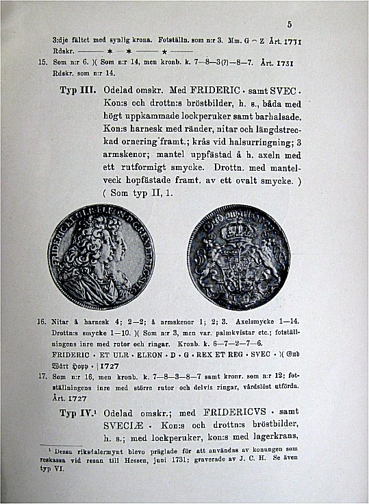 Förutom de reguljära präglingarna uppehåller hon sig vid "Mynt av dubbel vikt" och "Riksdalermynt präglade i annan metall än silver". Bland de sju katalognummer som avser den senare gruppen återfinner vi tre stycken av guld, nämligen jubelriksdalern 1721, den s.k. Hessen-riksdalern med dubbelporträtt och trekronors-glob på frånsidan samt d:o med endast Fredriks bild och text på frånsidan. Samtliga är slagna till 10 dukaters vikt (dvs. ungefär 34,8 g).
