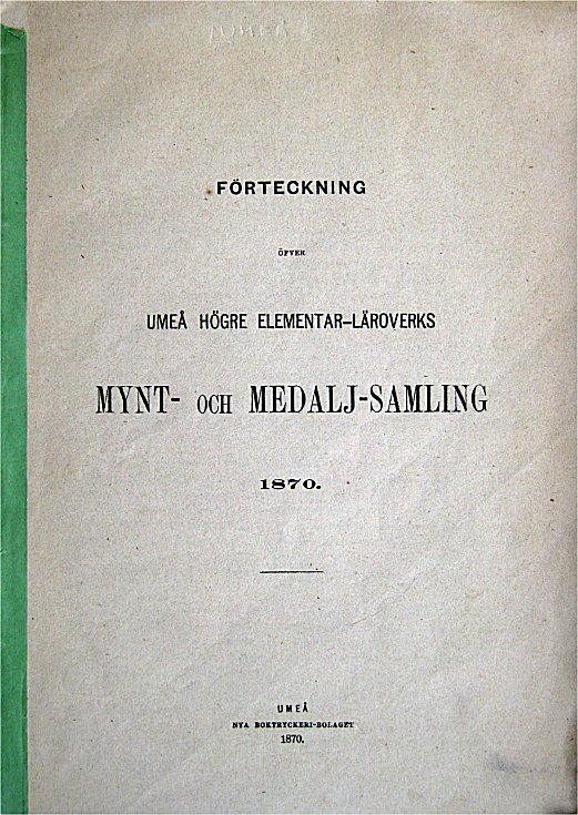 Umeå Högre Elementar-läroverk är år 1870 ganska tidiga med att publicera en förteckning över sin mynt- och medaljsamling. I förordet nämns inledningsvis,