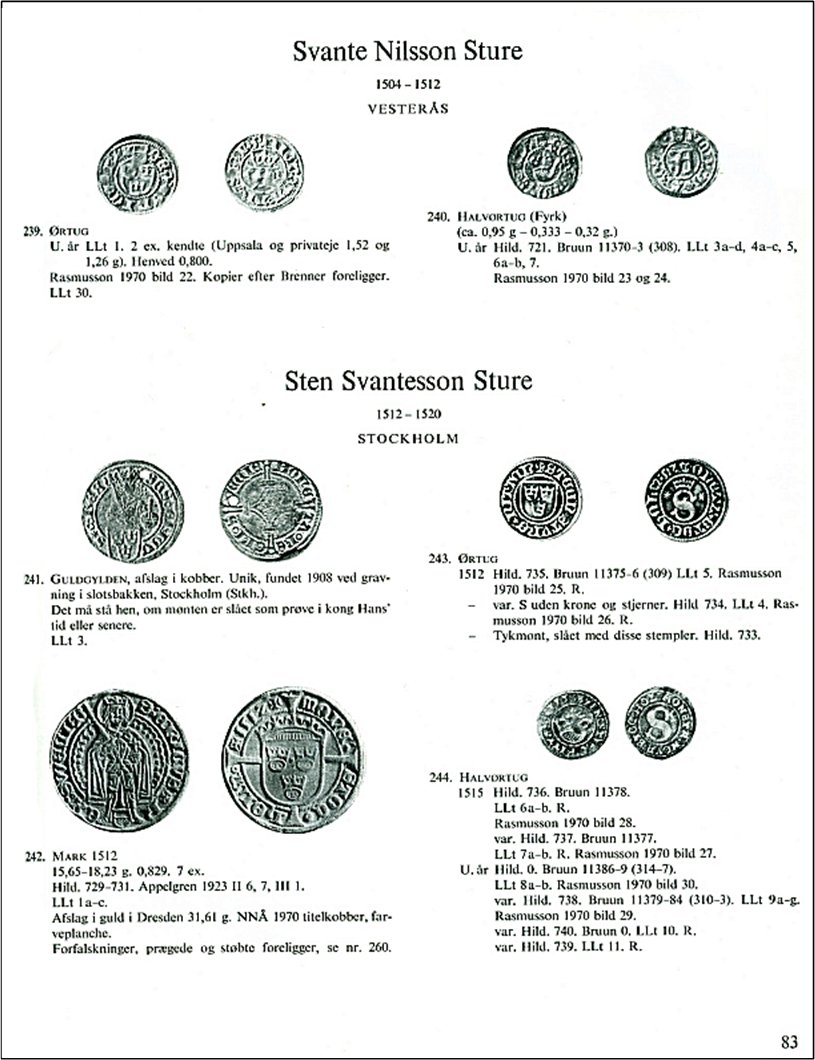 Se mynt 242 i bilden ovan. Det är en Mark från år 1512, och den är känd i 7 exemplar. Vikterna för dessa exemplar varierar mellan 15,65 och 18,23 gram, vilket har gjort folk fundersamma. Se Myntbloggen per den 29 augusti 2012. Hursomhelst så ansåg Galster att de är mynt (Sveriges första stormynt i så fall). Ett avslag i guld är också känt. Galster nämner att förfalskningar av Mark 1512 förekommer och han hänvisar till nr 260 "Sturemarken" i kapitlet om falska mynt.